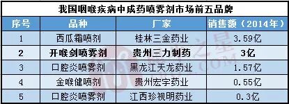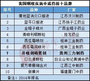 凭借产品组方、原材料以及剂型构成的独特优势,近几年开喉剑喷雾剂的市场接受度和份额不断提升。据CFDA南方医药经济研究所数据,开喉剑喷雾剂在我国咽喉病中成药市场份额的排名已从2011年的第32位上升至2014年的第7位,同期在医院终端市场份额的排名则从第17位上升到了第3位。