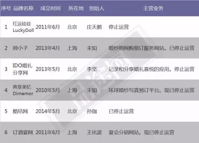 低频消费,缺乏资源。婚嫁行业的互联网化进程较短。在本次盘点中盘点出的已经停止运营的大部分企业成立时间稍早。由于婚嫁行业是低频需求的行业,如何提高用户粘性,不断的拓展产业链(横向或纵向)就成了每个企业亟待思考的问题。