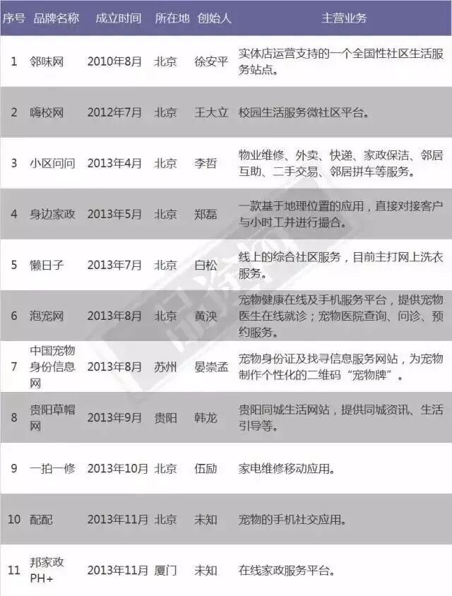 本次盘点的社区O2O死亡企业有11家,其中有9家是在2013年成立的,所在城市以北京为主,涉及行业有家政综合服务、洗衣服务、家电后服务、宠物照顾、校园电商、物业服务。