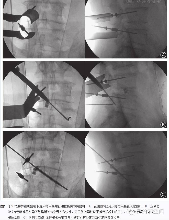 在我们自行设计的瞄准器(专利号:ZL 2009 2 0120264.5)[23]引导下于对侧置入椎板关节突螺钉[19,24,25],单节段置入一枚,双节段置入两枚。取出椎弓根定位针,分别置入螺钉(单节段病变置入两枚,双节段病变置入三枚),安装钛棒并适当进行椎间压缩。置钉操作均在"C"型臂X线机监视下完成(图2)。