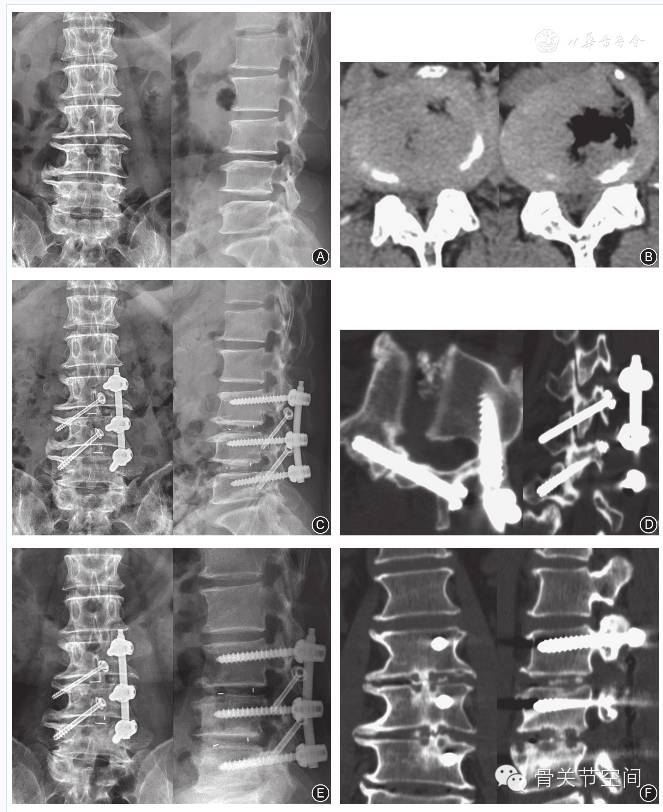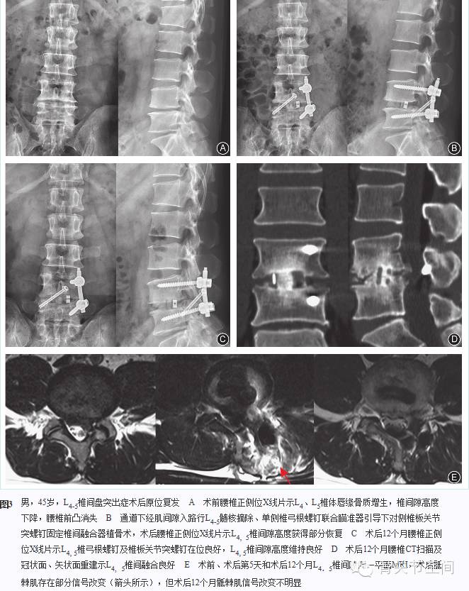 本组2例出现神经根损伤,1例在减压侧,为术中置入融合器(香蕉型)时直接损伤所致;另1例在对侧,原因不明。1例出现马尾损伤,为巨大型腰椎间盘突出症患者,使用了香蕉型融合器,椎板关节突螺钉完全进入对侧椎管,考虑为硬脊膜牵拉和椎板关节突螺钉损伤共同作用所致。