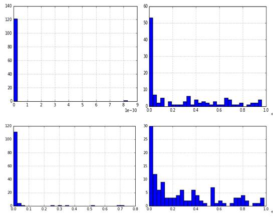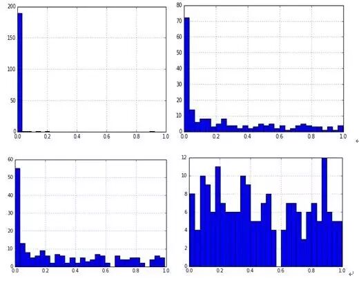 下面检验自变量系数的显著性,从左向右依次为MKT、SIZE、HTM和MOM的P-value分布。普遍来看,在大部分模型中4个因子系数均显著。