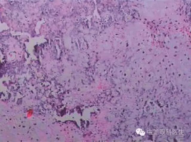 体格检查:双眼矫正视力0.8。右眼眼睑位置及眼球运动均正常,左眼上睑下垂,遮盖瞳孔上半部分,提上睑肌肌力4mm,左眼不能外展,上转、下转、内收运动均部分受限。患者右眼瞳孔直径3mm,左眼4mm;右眼对光反射灵敏,左眼迟钝,RAPD(-)。双眼眼底、眼压均正常。视觉诱发电位(visual evoked potential,VEP)、视野检查均未见明显异常。头颅MRI平扫+增强结果显示,左侧鞍旁海绵窦内T1WI稍低信号、T2WI稍高信号影,大小为21mm×23mm×22mm,增强扫描病灶呈不均匀强化,内可见多发的未强化区,左侧颈动脉海绵窦段受压外移,但结构未见明显损害(图2-3-0-1)。头颅CT平扫显示左侧鞍旁密度减低影,CT值为21Hu,大小为2.3cm,边缘可见钙化影,双侧眶内和球后未见异常(图2-3-0-2)。患者转入神经外科并行经额颞颧弓硬膜外入路左侧海绵窦区占位性病变切除术。术中快速冰冻切片病理学检查示,切除的组织标本富含黏液,制片困难。术后病理报告:左侧海绵窦区软骨源性肿瘤。考虑软骨瘤可能性大,局部细胞生长活跃,细胞间质伴黏液变性,免疫组织化学染色显示,肿瘤细胞对S-100和CK均呈阴性反应(图2-3-0-3)。术后患者左眼视力下降,额部及颊部皮肤感觉迟钝。眼科检查:右眼检查同术前,左眼矫正视力0.5,角膜上皮粗糙,角膜荧光素染色弥漫性着色,RAPD(-)。检眼镜检查示视盘界清,色红,视网膜血管走行正常,黄斑区未见明显异常。VEP、视野检查均未见明显异常。给予玻璃酸钠滴眼液点左眼、重组牛碱性成纤维细胞生长因子软膏涂左眼结膜囊并给予营养神经、改善全身血液循环药物治疗1周后,检查示见角膜上皮透明,角膜荧光素染色不明显,矫正视力0.8,左眼提上睑肌肌力测试可上提10mm。术后1个月复诊见,上睑下垂治愈,眼球运动受限明显好转。