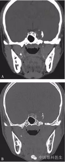 注:A.软组织窗;B.骨窗。左侧鞍旁可见密度减低影,CT值21Hu,大小约为2.3cm,边缘可见钙化影,双侧眶内和球后未见异常