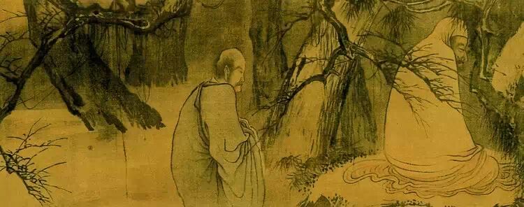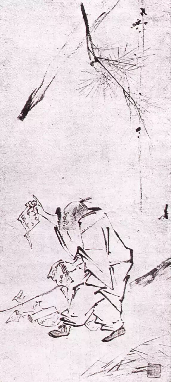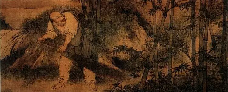 梁楷是个参禅的画家,属于粗行一派。不拘法度,放浪形骸,与妙峰、智愚和尚交往甚密,虽非僧,却擅禅画。禅宗约起于公元五二○年,到唐代已成气候,分南北两宗。唐高僧慧能为禅宗六祖,主顿悟说,为南宗之祖师。南禅之说,强调佛祖在人心,喝水担柴,都能悟道。所有的宗教仪式毫无价值,人们不需要诵经,便可以一种超知识的状态与“绝对精神”或“真理”沟通,这是一种自然深奥的抽象体验。“六祖伐竹”表现的就是慧能在劈竹的过程中“无物于物,故能齐于物;无智于智,故能运于智”。梁楷的《六祖伐竹》是其中年以后的作品,笔墨极为粗率。笔笔见形,笔路起倒,峰回路转,点染游戏;欲树即树,欲石即石,“心之溢荡,恍惚仿佛,出入无间”。梁楷似乎也参弹入画,视画非画了。他的人物画很简单,很概括,也很生动。这三者都能体现在他的用笔上。画中险笔很多,起粗落细,急缓轻重,变化多端;金错刀作墨竹,山石大笔扫出。画中有一种意念贯穿着,此念意深澹远,故能平复笔墨的运动变化。读梁楷的画实际上是一种笔墨体验,也是一种心境的体验,更是一种禅意的体验。日本人很重视这幅画,与他们参佛重禅的文化心理有关,当然也和这幅画的艺术价值和历史文化价值有关。