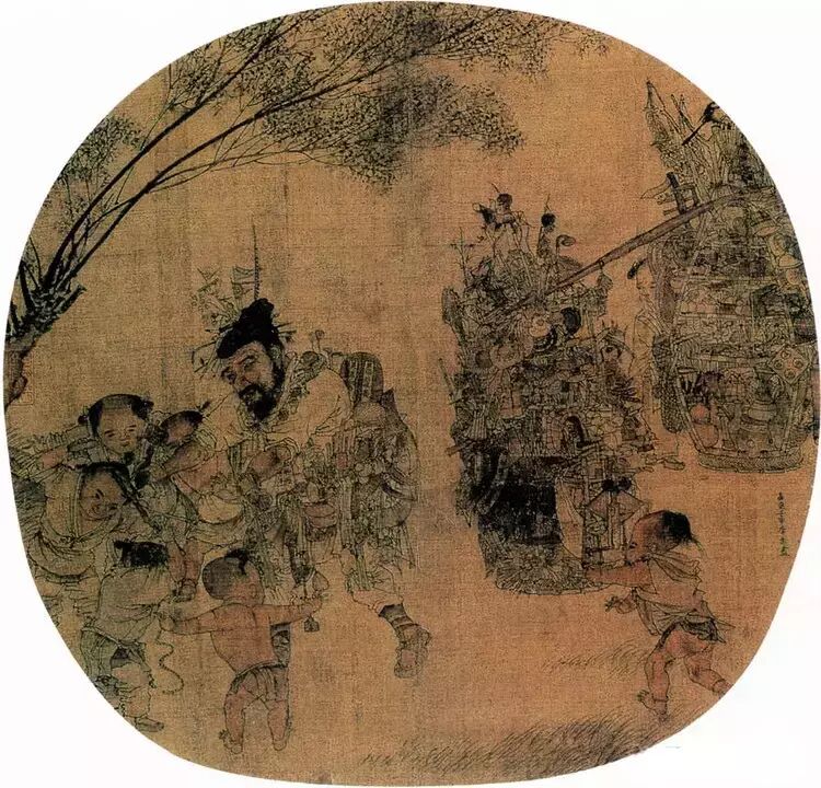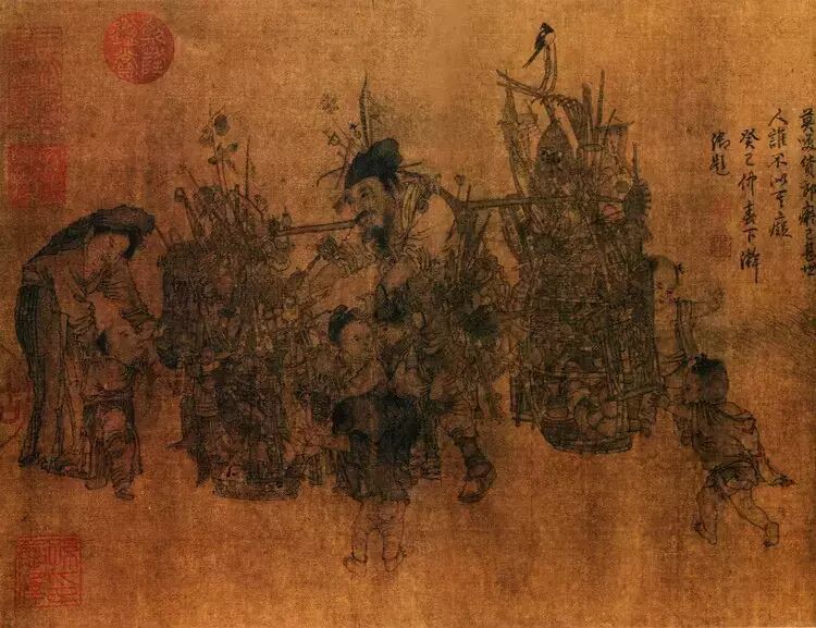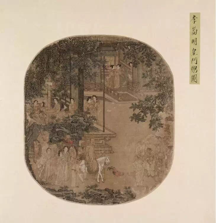 相传为宋代李嵩(浙江钱塘人)所绘。本图园中高木奇石,枝叶掩映翁郁,树下士人持拂闲坐于榻上,左腿盘起,聆听拨阮演乐并赏古玩。旁有仪态娇美仕女,焚香、拈花、持扇随侍。人物线条流畅,绘法近似明代画家杜蓳、唐寅。床面为藤编软屉,透气适合炎夏使用;床榻上置有直搭脑交椅式躺椅,没有腿足,供坐时后背依靠的调节式活动支架,一般适合在床上或席上使用。榻前方形香几有束腰、直腿、下为如意足、托泥。此方几造型与床榻成组用以承放香炉。 【名称】宋 李嵩 货郎图 本幅款署:“嘉定辛未李从顺男嵩画。”另有清乾隆帝御题七言诗一首。这是一幅人物风俗画卷,画面上货郎肩挑杂货担,不堪重负的弯着腰,欢呼雀跃的儿童奔走相告,喜悦之情溢于言表。货担上物品繁多,不胜枚举,从锅碗盘碟、儿童玩具到瓜果糕点,无所不有。在商品流通尚不够发达的南宋时期,货郎们走街串巷,一副货担就是一个小小的百货店,货郎们不仅为偏僻的乡村带来所需的货物,也带来各种新奇的见闻,货郎的到来往往象节日般热闹,李嵩在图中就描绘了这样一幅场景。画家借助货郎这一题材表现了南宋市井生活的一个侧面,那些令人眼花缭乱的物品,虽然今天有很多已不明其用途,但却真实地记录了南宋百姓的生活方式,是民俗学家不可多得的珍贵史料。画面中人物的塑造主要依靠线描勾勒,细秀的笔划辅以淡雅的设色,使画面古朴沉着。人物动态鲜明,无一雷同,显示出画家的写实功底。繁而不乱的货物描绘得一丝不苟,更显示了李嵩“尤长界画”的技巧。《石渠宝笈·初编》著录。 李嵩 明皇斗鸡图