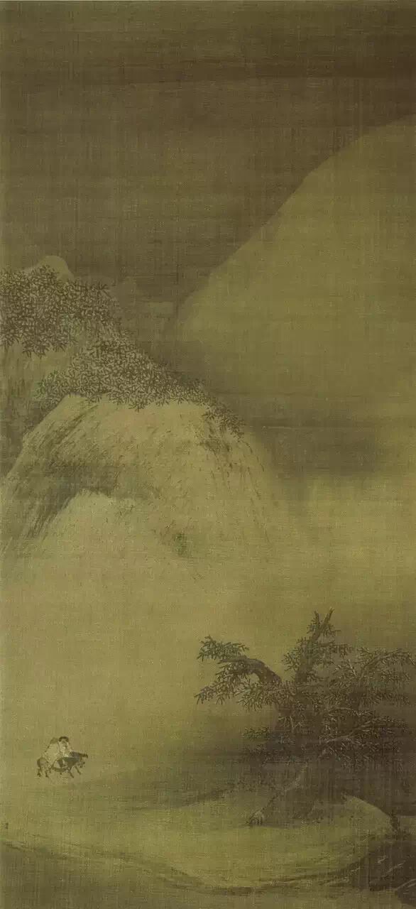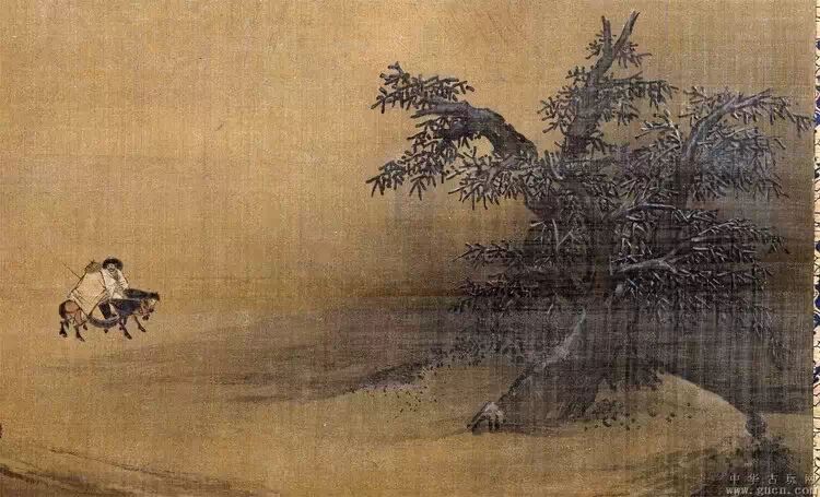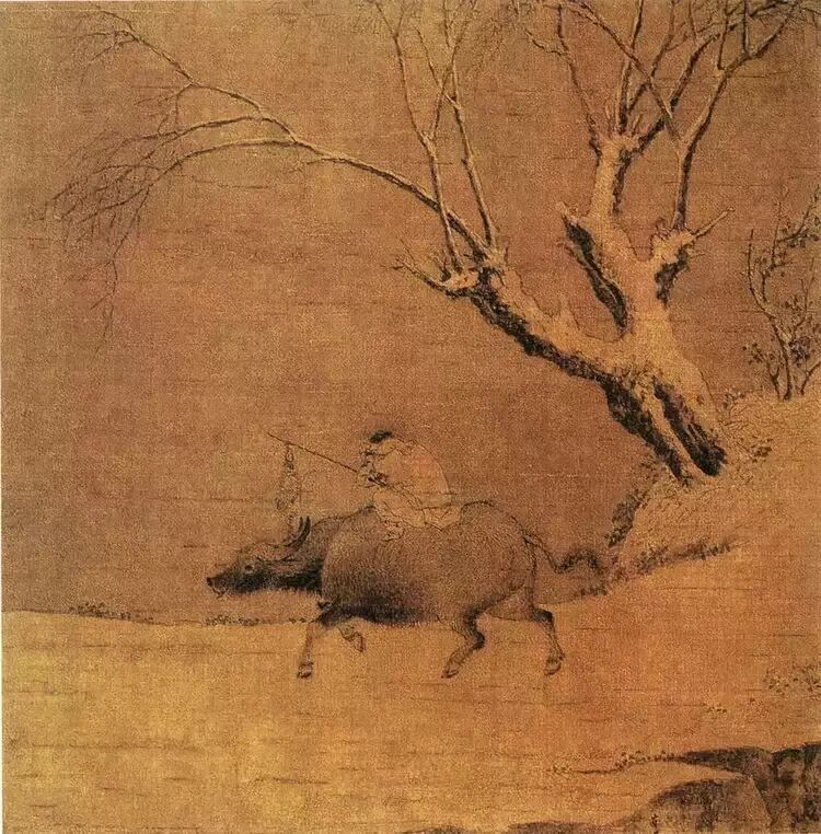 此图描绘白雪皑皑的寒冬,牧牛人带着猎物归家的情景。牧牛人蜷缩着身子以御寒风,人与牛的动态准确生动,树石山坡的笔墨变化微妙,设色也雅润柔和。虽为小品,但很好地表现出雪后空疏静谧的景色。