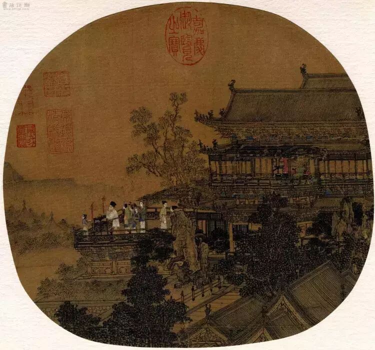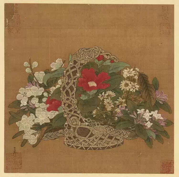 此图左边画一大骷髅,头戴幞头,身着彩衣,手提另一小骷髅做游戏。旁有一妇人,袒胸,喂哺幼兒。对面一小兒,手足着地,仰首伸臀。小兒后另一妇人作伸手阻拦状。墩子、货郞担,小竹相衬。有的学者认为,此画的核心主题当为生死转化及其因果轮迴,或者与庄子“齐生死”之说有关,是否如此,録以待考。图中用笔坚韧扎实,衣纹细劲流利,器物、肌肉、骨骼刻画匠心独具。设色精致古雅,颇具南宋院体画特色。画面左侧署有“李嵩”二字款,对幅有毛玄真书元人黄公望句,钤“信公珍赏”、“会侯珍藏”等印多方。曾经清人耿昭忠收藏,未见著录。 【名称】宋 李嵩 花篮图 此图重设色,描绘盛开在精美的花篮中的鲜花。全图画风工整艳丽,为工笔重彩画中的佳作。画面左下方款署:“李嵩画”三字,其下方押“项子京家藏”半印。 李嵩 汉宫乞巧图页 27×25.5cm 李嵩绘画题材丰富多彩,从宫廷到民间、从城市到农村、从生产到生活、从吃喝到娱乐、从仙山到龙宫、从历史到现实均在画中有所反映,所作有精工鲜丽之院体画,如《明皇斗鸡图》、《花篮图》;有白描淡色之风俗画,如《货郎图》;也有水墨渲染之山水画,如《西湖图》等。传世作品有嘉定四年(1211)作《货郎图》卷、《花篮图》页、《骷髅幻戏图》藏故宫博物院;《西湖图》卷藏上海博物馆;《听阮图》、《夜月看湖图》等藏台北故宫博物院。 李嵩的风俗画更为知名,他画过许多表现下层社会生活的农村生活风俗画,把劳动人民的生活作为审美对象来描绘,这在中国古代美术发展史上有着重要的意义。 |