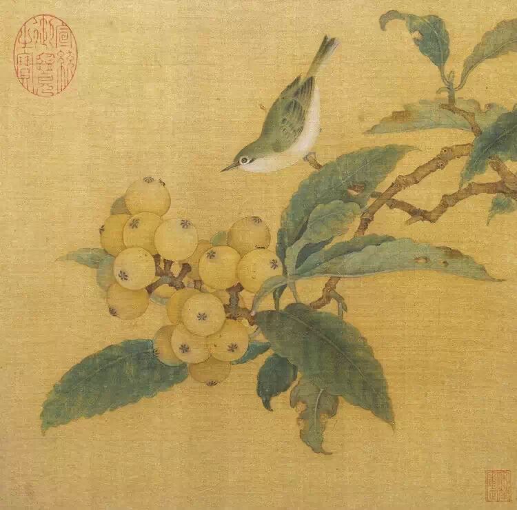 此图绘有林檎果一枝,枝上硕果累累。其上栖息一小鸟,翘起尾巴,挺起毛茸茸的胸脯,作欲飞的情态,形象生动可爱。悬挂着沉甸甸果实的枝柯,仿佛在轻轻地颤动。果叶正反两面的枯荣之态刻画细致,连虫蚀的痕迹都颇为清晰。画面虽然简单,却充满生气盎然的意趣,具有强烈的感情色彩。全图笔法精工,设色妍美,是南宋初期花鸟画的代表作。 林椿(公元12世纪)〔南宋〕钱塘(今浙江杭州)人,生卒年不详,南宋孝宗淳熙(1174-1189)间画院待诏,赐金带。工画花鸟、草虫、果品,师赵昌,宗徐崇嗣。傅色轻淡,深得写生之妙,极富生趣,所作花鸟果品直接以色彩分出物象之浓淡,层层晕染阴阳向背,饱满莹润轻匀透明,四实烂漫,鸟雀偷窥,惊飞欲起,栩栩如生,尤小幅笔触工细,布色鲜明,静中寓动,生机盎然,为世人所宝。钱良右题其《茶花鸽子图》云:“林椿真迹,世不多见,或得片缣寸纸,不啻天球河图。此卷《茶花鸽子图》,经营布置,各极其态,览之景物生情,宛然欲活,可谓曲尽能事者矣。若后世懒弱柔腕,率意而成者,乌能如是耶?”传世作品有《枇杷山鸟图》册页,绢本,设色,纵26.9厘米,横27.2厘米,笔法精细,它与《果熟来禽图》册页、《葡萄草虫图》册同藏故宫博物院;《梅竹寒禽图》册页藏上海博物馆;《写生海棠图》册页藏台北故宫博物院;《花鸟图》卷图录于《浙江古代画家作品集》。 |