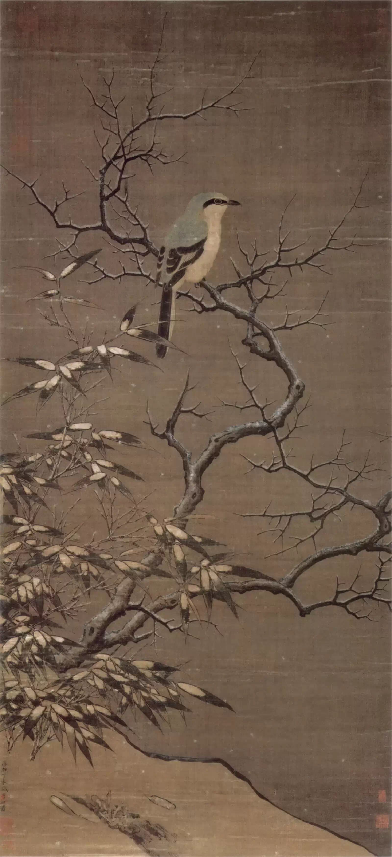 南宋 李迪《雪树寒禽图》,绢本,立轴,设色,纵:115.2厘米,横:52.8厘米。