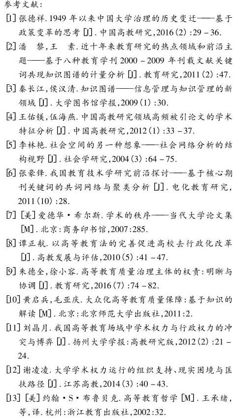 十八届提出“推进国家治理体系和治理能力现代化”,高等教育作为社会事业的轴心部分,其治理结构包括于国家治理体系,其治理能力的提升也必将推动国家治理能力的现代化进程。我国高等教育治理经历由“以大学内部领导体制探索为中心”转向“以大学内部管理体制改革为重点”,最后走向“以完善中国特色现代大学制度为主旨”的三个发展阶段[1]。在新的历史时期,运用可视化科学计量学的方法对我国高等教育治理的相关研究文献进行元研究,不但能够给我们提供一种新的视角来重新审视高等教育治理研究的热点主题与前沿趋势,而且对于推进高等教育治理的理论深化与实践探索具有十分重要的理论价值和实践意义。