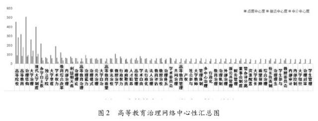 从图2中可以看出,诸如治理结构、大学治理、现代大学制度等的点度中心度与中介中心度指标均很高,这说明它们既是现阶段高等教育治理的研究热点,也是开展其他研究的媒介与桥梁。中介中心度较高而点度中心度与接近中心度较低的高频关键词几乎没有,说明在高等教育治理领域还未形成明确的研究趋向。不过依然可以从图2中看出“公共治理”的中介中心度指标相对较高,这在某种程度上说明其他权力主体介入高等教育治理的“公共治理”模式将在未来一段时间内得到学者关注,其理想目标是达到高等教育的善治,这与我国公共领域治理范式的转型相吻合。