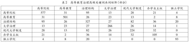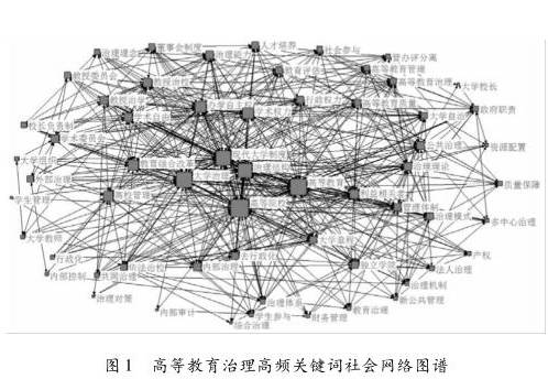 从表1可以看出,排在前十位的高频关键词分别为高等院校(577)、高等教育(501)、治理结构(327)、大学治理(266)、现代大学制度(224)、办学自主权(105)、独立学院(93)、大学章程(78)、学术权力(78)和教育综合改革(61),这些高频关键词基本上显现了现阶段高等教育治理领域的发展态势及价值追求。但是,仅对高频关键词进行词频分析还不足以说明高等教育治理的研究热点及其内部关系,这就需要我们通过构建高频关键词的社会网络图谱以进一步挖掘高频关键词间隐藏的其他重要信息。