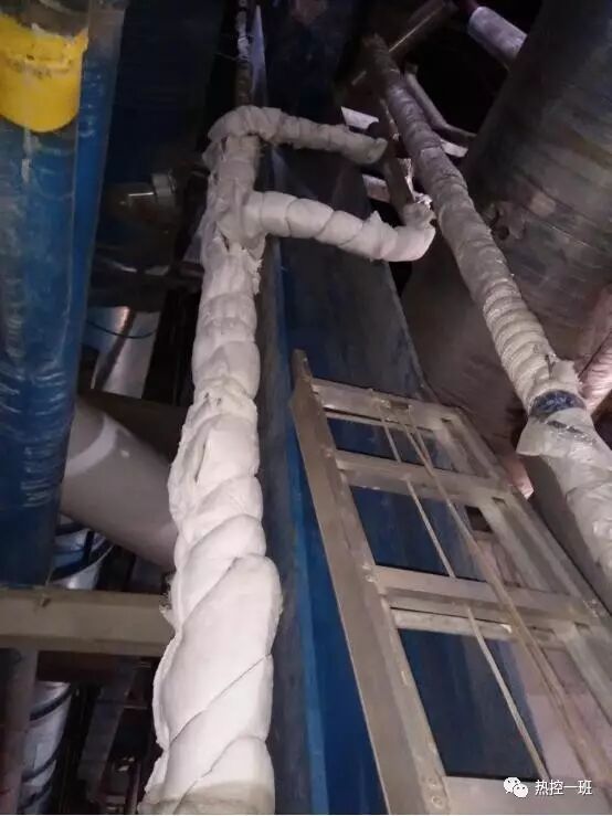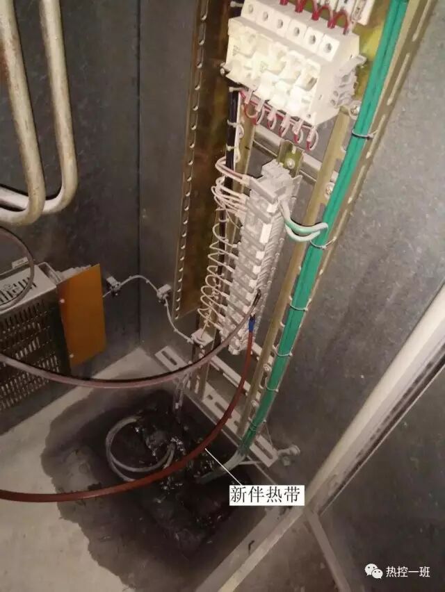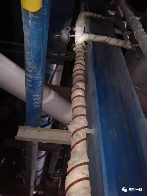 二、2016年11月,我们将2号炉暖风器水位原先的伴热带予以拆除,对正负压侧伴热带重新缠绕。先将正负压侧仪表管用保温包好,然后用一根伴热带从正负压侧表管的公共部分开始缠绕,将两个仪表管当作一个整体,在其保温层外面呈螺旋状均匀地缠绕伴热带,每一圈之间的间距不能太大,确保加热均匀,伴热带一直缠到进变送器柜,最后再在伴热带完美敷设一次保温,在伴热带控制柜中只需接一根伴热带即可,如下图所示: