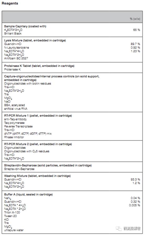 任何一个芯片的检测归根结底都是生化试剂之间的反应,而芯片的作用是将这些复杂的生化反应集成在一个小范围内部实行,仪器的作用却是完全为芯片服务,促使芯片实现按步骤按体积进行生化反应。Alere q HIV检测芯片也不例外,所以我们有必要先了解下该检测芯片内部的试剂种类和组分,在前面部分中我们知道,该检测芯片中包含有干粉试剂和液体试剂,各部分试剂的具体组分如下表所示。各位专业技术人员应该可以从这些试剂组分就可以看出每种试剂的具体作用,此处不再赘述。
