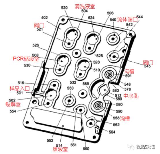 为了达到上述流体运转和HIV检测的目的,需要芯片内部各部分结构的配合,下图是该芯片上表面结构图,虽然和实际产品有些差别,但其基本结构却是类似的,图中可以看到有裂解液室,清洗液室,PCR储液室等等结构。