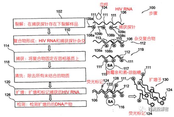 B,探针捕获:特异性捕获探针(特异性寡核苷酸)与HIV-1和HIV-2基因组序列进行互补性杂交,这些捕获探针在其3`-端偶联有生物素基团。