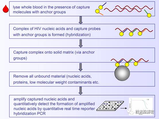 A,RNA释放:使用离液盐(chaotropic salts,能破坏生物大分子三维结构的化学物质)完全破坏待检样品,使其细胞破裂并释放出所有核酸,包括结合细胞的HIV的RNA和血浆中HIV颗粒的RNA。