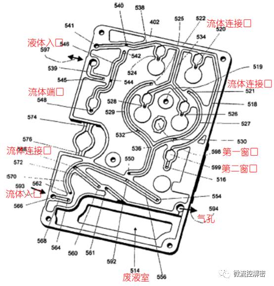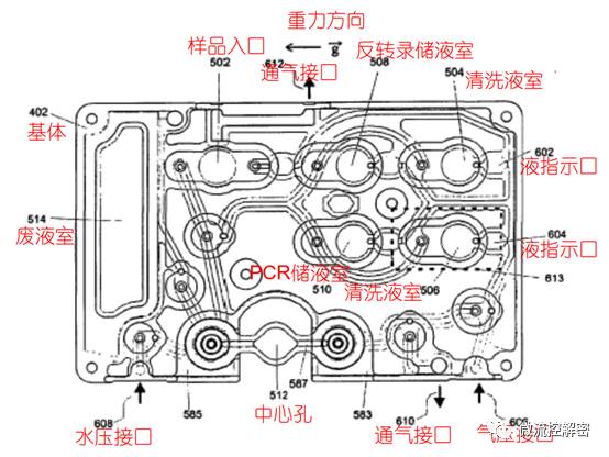 正面和反面图单独来看,难以看出其中的流体网络结构,也对该芯片的工作模式不甚理解,幸好该公司的专利中还公开了这两个部分结合起来的结构图,如下所示。从这个图中可以大概看出该芯片上流体的运作模式。这个图中的流体网络与实际产品相比减少了下方的液体储液池,而是以水压接口等来表示。