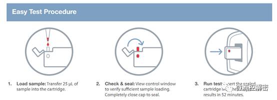 据Alere官网介绍,Alere q检测平台采用多重实时PCR方法来进行HIV检测,可以同时检测多个目标分子,即该检测平台可以区分并同时检测HIV-1(M/N)亚型,HIV-1(O)亚型和HIV-2型病毒。检测步骤也很简单,对于用户而言,只需采血-盖上盖子-插入仪器这三个步骤就可以,如下所示。