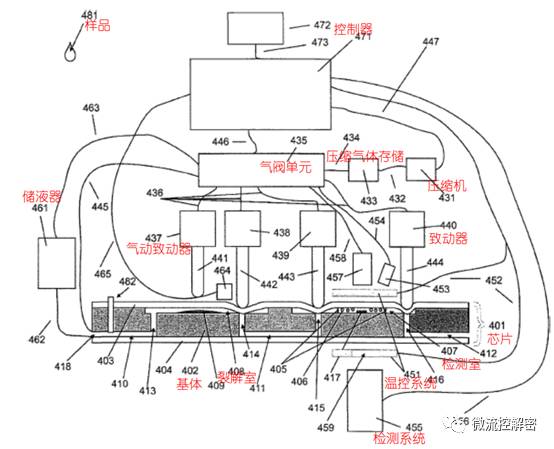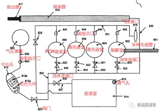 仪器中的主要结构为气压控制系统,包括压缩机,压缩气体存储器,气阀单元,气动致动器等,这些部件的主要作用是在气压的作用下促使气动致动器发生推动,从而挤压芯片上面结构,促使芯片内部的腔室或阀门关闭和打开,进而控制流体的流向。同时该气压控制系统还有个气压接口连接到芯片上,促使芯片内液体在气压的作用下发生运转。感兴趣的朋友可以通过该公司的专利进一步深入了解仪器内部结构。