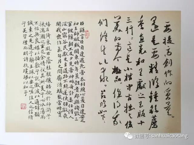 但不得不承认,其实在晋代的许书家都有变革思想,且做得也很深刻,经过王羲之、王献之父子的整合,创新、草书、行书以一种新的面目出现,逐渐成为一种时风,尽管当时也属于流行书风,但其生命力在于二王父子强调了用笔的使转,使笔势转折而连锦,结构上打破匀称,体势上富于变化,线条流动而极具韵律美,从而逐步摆脱章草的波磔,以及章草明显带有隶书笔意的程式化。