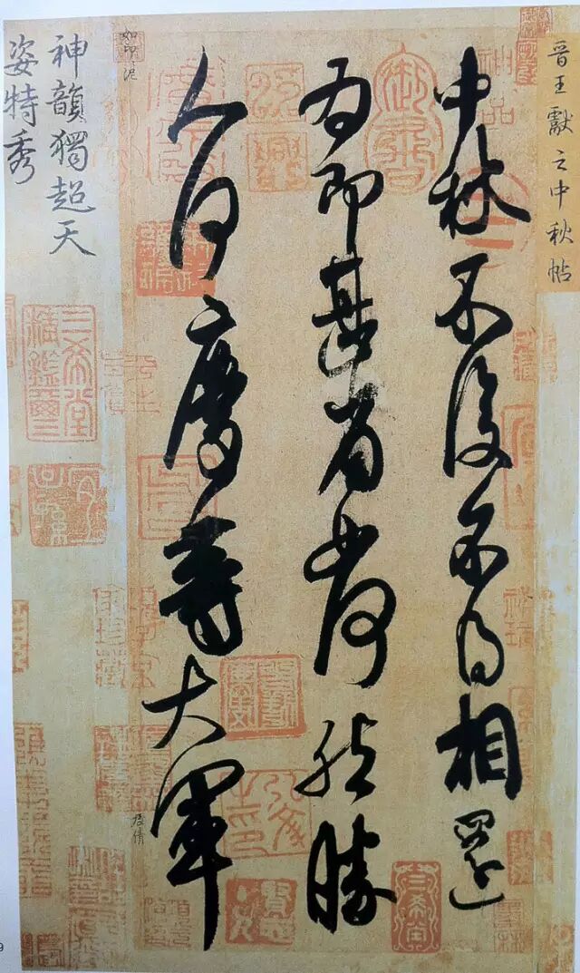 王献之(公元344—386年)字子敬,小字官奴,出生于会稽山阴,王羲之第七子,历官建武将军,吴兴太守,中书令,人称“大令”,擅楷、行、草诸体,初从父学书,后学张芝改变制度,别创新法,虞和在《论书表》中说他“始学父书,正体乃不相似,至于绝笔章草,殊相拟类,笔迹流悻,宛转妍媚,乃欲过之”。《书议》中也说他“行草之外,更开一门,非草非行,流使于草,开张于行。”总之王献之的行草书大开大合,上引下带,离方遁圆,笔势连绵,传世墨迹有《鸭头丸帖》、《东山帖》、《二十九日帖》、《地黄汤帖》、《中秋帖》(图3)等。