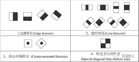 描述:上面的任意矩形放到人脸区域上,将白色区域的像素和减去黑色区域的像素和,得到的值称之为人脸特征值,如果把这个矩形放到一个非人脸区域,那么计算出的特征值应该和人脸特征值是不一样的,这些方块的目的就是把人脸特征量化,在统计学的基础上区分人像和非人像。
