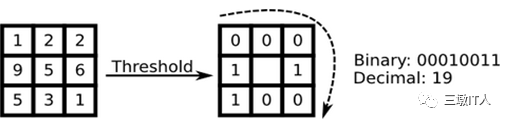 描述:以邻域中心像素为阈值,将相邻8个像素的值与其进行比较,若周围像素值大于中心像素值,则标记为1,否则为0。这样3x3邻域内的8个点产生8位二进制数,即得到该邻域中心像素点的LBP值,并用这个值来反映该区域的纹理信息。