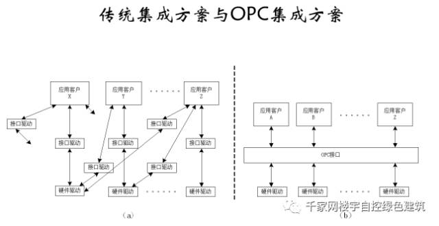 OPC为解决系统集成问题提供了便捷的解决方案。在这种解决方案中,包括OPC服务器与OPC客户。OPC服务器一般并不知道它的客户,由OPC客户根据需要接通或断开与OPC服务器的链接。OPC的作用就是为服务器/客户的链接提供统一、标准的接口规范。按照这种统一规范,各服务器/客户之间可组成如图 (b)中所示的链接方式。各客户/服务器间形成即插即用的简单、规范的链接关系。与(a)中的情形相比,显然简化了许多。