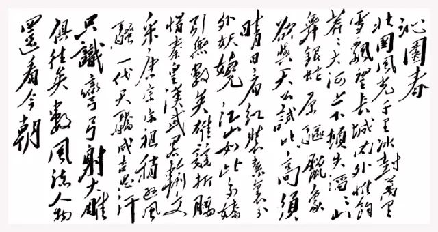 北国风光,千里冰封,万里雪飘。望长城内外,惟余莽莽;大河上下,顿失滔滔。山舞银蛇,原驰蜡象,欲与天公试比高。须晴日,看红装素裹,分外妖娆。江山如此多娇,引无数英雄竞折腰。惜秦皇汉武,略输文采;唐宗宋祖,稍逊风骚。一代天骄,成吉思汗,只识弯弓射大雕。俱往矣,数风流人物,还看今朝。
