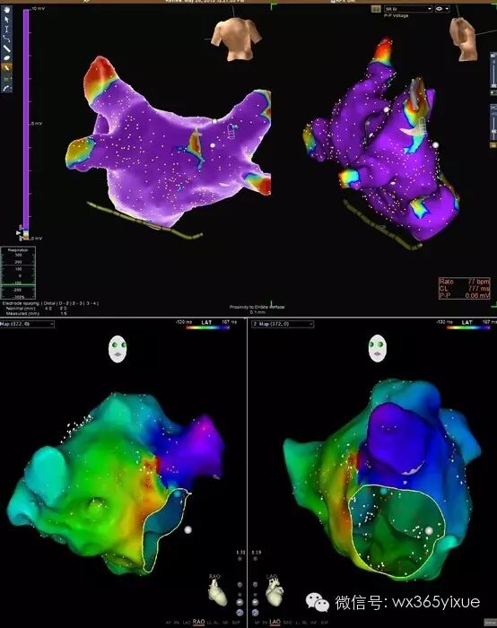 图5-1 左心房高密度标测 上半图为左心房电压标测图、高密度标测下发现左房后壁存在小片异常电压区域,下半图为心动过速下左心房激动顺序图,提示围绕二尖瓣环折返的房性心动过速。