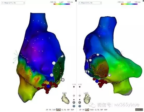 2.诊断及标测峡部:导管头端的双A波及缓慢传导电位是判断峡部位置的最可靠指标而不。是X线影像中心房的最低点18。如在上述各个部位快速建模采点后发现总激动时间未达到心动过速周长,提示可能折返方式存在一定变化,标测导管应进一步到位右房的游离壁和后壁补采激动点19。