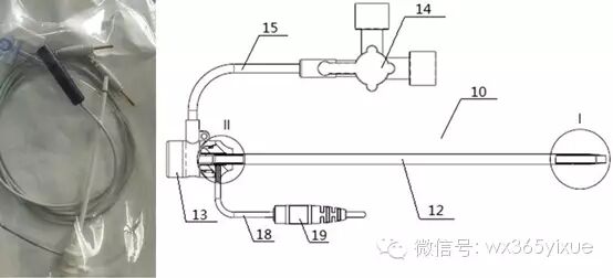 图 3- 2 用于单极标测参考的Clear®鞘。左图为实物图,右图为结构图。在鞘管的远端进入血管内部分设有电极,经导线引出至体外插头,可插入多导电生理仪的参考插孔,即实现腔内参考。
