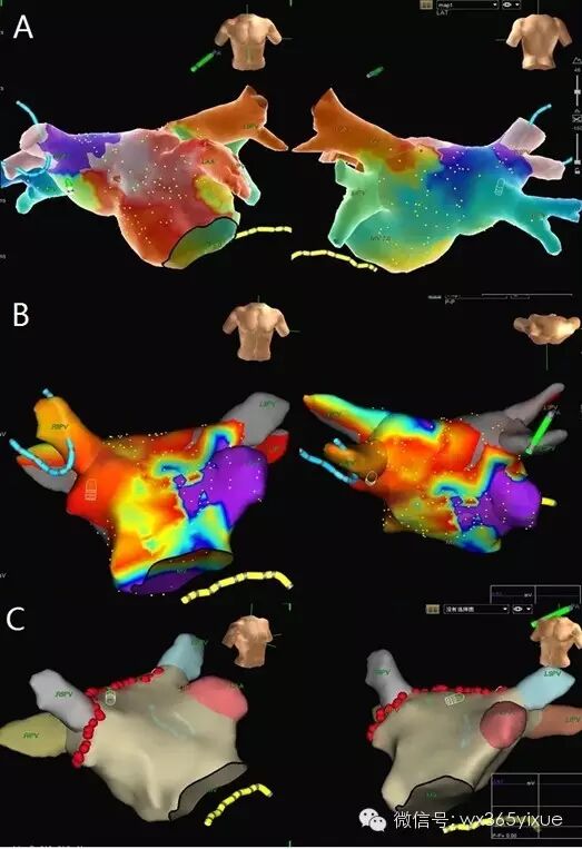 图5-3 运用激动顺序及基质标测指导消融左房房性心动过速 图A为左房激动顺序图,提示激动环绕左房前后折返;图B为电压标测图,发现顶部有一异常电压区域;图C为消融靶点图,在顶部异常电压区域消融即终止心动过速,最终行顶部线的消融并验证双向阻滞。