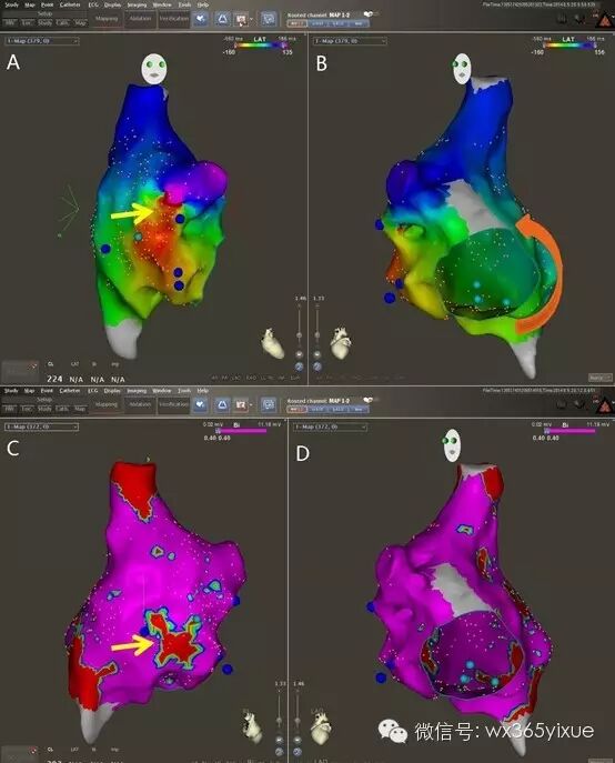 少数情况下,常规的激动标测图仍不能明确提示心动过速的机制和起源,特别是有心房内消融手术史或者合并有扩张型心肌病、瓣膜性心脏病等器质性心脏病变的患者,心房的基质标测是一个重要的手段,通过寻找心房内的异常电压区域,再结合激动顺序分析,常常能够解决这种疑难的心律失常。