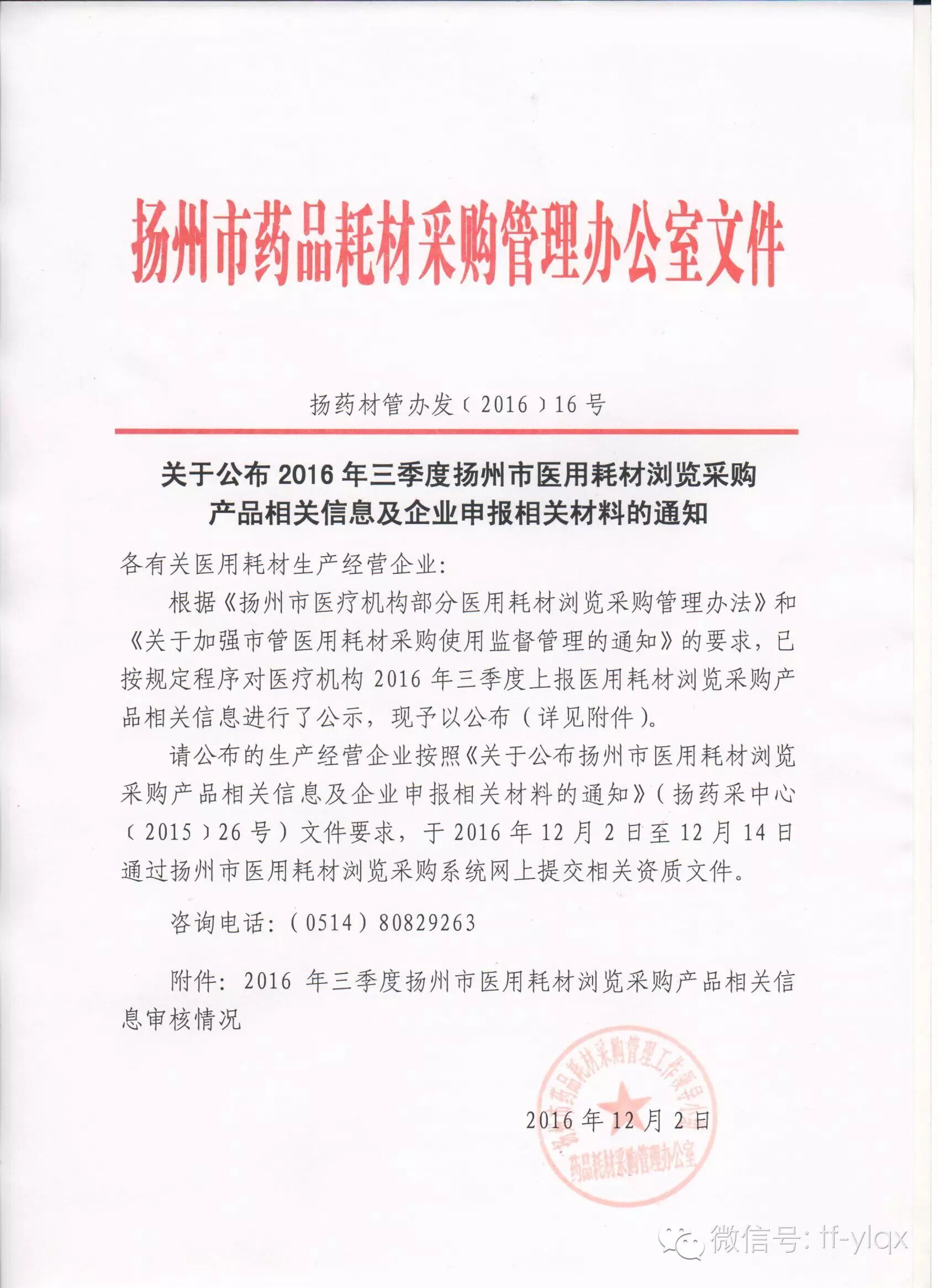 关于公布2016年三季度扬州市医用耗材浏览采购产品相关信息及企业申报相关材料的通知
