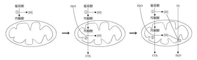 例:有氧呼吸是指细胞在氧的参与下,通过多种酶的催化作用,把葡萄糖等有机物彻底氧化分解,产生二氧化碳和水,释放能量,生成许多ATP的过程。这个概念很长,实际上我们需要清楚的是有氧呼吸的每一个阶段发生什么生化反应。脑海中要有一张动态图,如下。