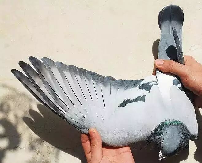 其三是羽毛结构的退化受先天遗传和后天生长发育的共同影响,特别是双翼飞行羽毛的形态结构,从最优秀赛鸽双翼飞行羽毛的结构共性来看,翼羽长短适中,没有超短的羽毛结构,更少见长条羽毛的结构。除了适应顺风和逆风天气条件下单羽毛宽窄有差异之外,双翼飞行羽毛的整体排列紧密,羽干之间的宽度很窄。展开翅膀观察主副飞行羽毛尖端的整体排列,成扇形的园弧形。这种扇形的结构排列,有利于提高赛鸽在空中的升浮力和向前推进的速度。而赛鸽飞行羽毛的退化表现在主飞行羽毛的第七至第十支羽毛超长,而其它主飞行羽毛及副飞行羽毛相对较短。展开翅膀观察翼羽毛实端的整体排列,有的能连成一条直线,有的完全成下凹的弧形结构。并且双翼主副飞行羽毛羽干之间排列的间隙明显大于那些最优秀赛鸽的羽毛结构。因此,在适应竞翔自然环境和天气条件下出现了不少的困难。