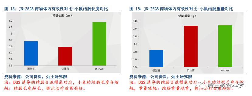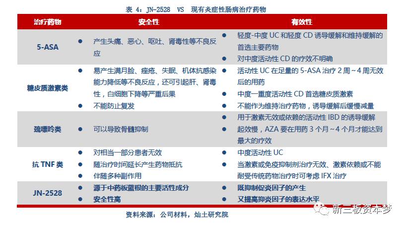 国内IBD市场TOP5的药物是美沙拉嗪(5-ASA)、英夫利西单抗、柳氮磺吡啶、甲氨蝶呤和硫唑嘌呤,与其相比,JN-2528在抑制促炎因子的产生和促进抑炎因子的表达方面有更良好的表现,源于中药板蓝根的主要活性成分使得安全性更可靠。