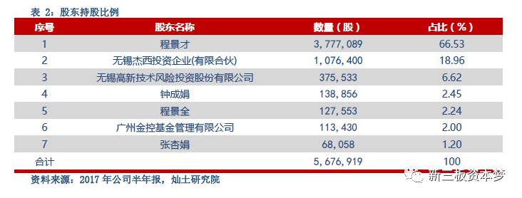 公司总股本5,676,919股,其中流通股2,381,160股,占总股本的41.94%。公司第一大股东董事长程景才持股3,777,089股,占总股本的66.53%,为公司实际控制人。无锡杰西投资企业(有限合伙)为第二大股东持股1,076,400股,占总股本的18.96%。无锡高新技术风险投资股份有限公司为第三大股东持股375,533股,占总股本的6.62%。