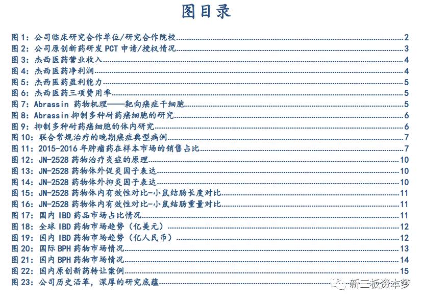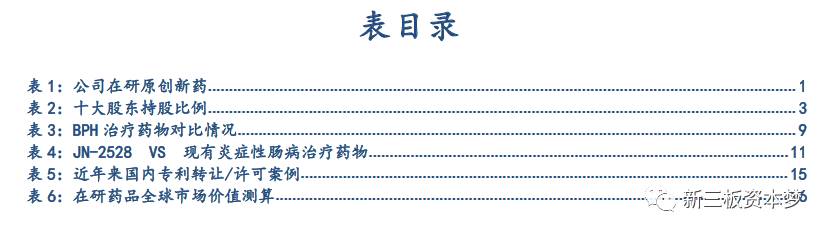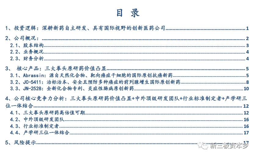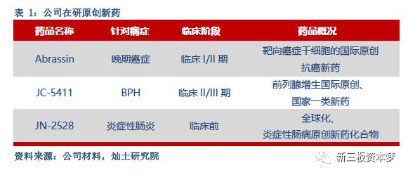 公司是一家专注于自然来源药物研发的高科技医药公司。主营业务是以天然产物活性成分为核心的常见病、多发病药物的研究和开发。公司专注于国际原创新药的研发,在研的3个原创新药具有极高的价值,对中国的新药研发意义重大。在研新药:①源自天然化合物、靶向癌症干细胞的国际原创抗癌新药Abrassin即将进行临床I/Ⅱ期试验;②金标准BPH全球首创新药、国家一类新药JC-5411已完成临床Ⅱ期试验;③全新化合物专利、炎症性肠病原创新药JN-2528。上述在研新药均已获得包括中国在内的全球专利保护。
