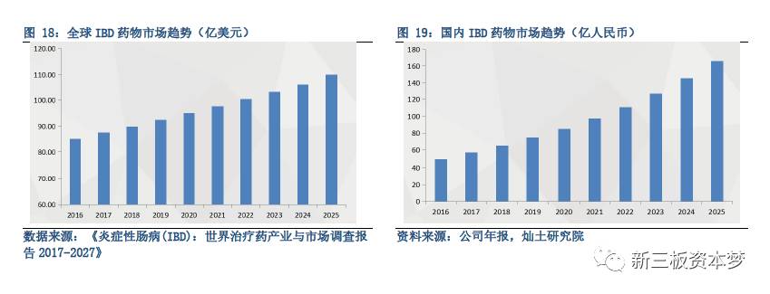 炎症性肠病(IBD)药品市场巨大,根据《炎症性肠病(IBD):世界治疗药产业与市场调查报告2017-2027》,2016年炎症性肠病(IBD)药物全球市场为85亿美元,2020年预计达到95亿美元,2025年将突破110亿美元。