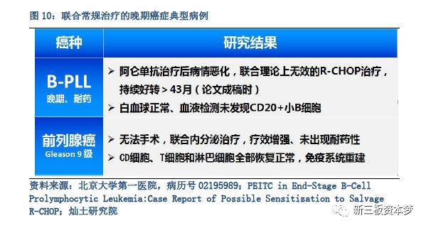 在晚期耐药B-PLL人体应用试验中,阿仑单抗治疗后病情恶化,联合理论上无效的RCHOP治疗,持续好转(>43月),白血球正常、血液检测未发现CD20+小B细胞;在Gleason 9级前列腺癌人体应用试验中,药物疗效增强、未出现耐药性,CD细胞、T细胞和淋巴细胞全部恢复正常,免疫系统重建。