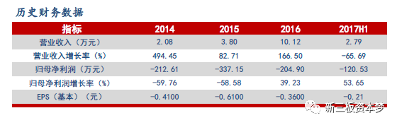 2017年上半年公司实现营业收入2.79万元,同比增长-65.69%;同期公司实现归母净利润-120.53万元,同比增长46.94%;当期公司毛利率为88.70%,较去年同期的81.51%增长7.19pct。