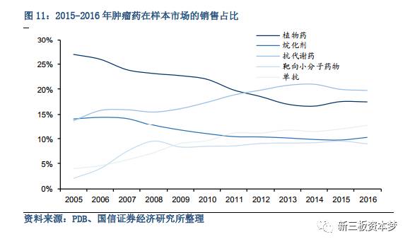 国内肿瘤用药市场正在进行产品升级换代。自2005年起传统植物药和烷化剂销售占比逐年递减,靶向小分子占比则从2005年的2.0%上升至2016年的8.9%,单抗药物从2005年的3.9%上升至2016年的12.6%。据智研数据研究中心统计,2014年中国抗肿瘤市场约 837亿,2010-2014 年复合增长率近20%。假设肿瘤用药仍以细胞毒类等低价药物为主,2020年前中国肿瘤药市场预计将达到1000亿元。