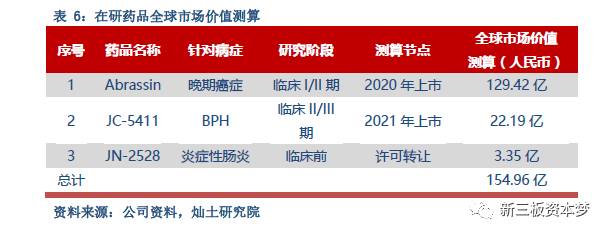 ①源自天然化合物、靶向癌症干细胞的国际原创抗癌新药Abrassin即将进行临床I/Ⅱ期试验;在“B-PLL晚期耐药”、“前列腺癌Gleason 9级”联合常规治疗的晚期癌症典型病例应用试验中,均取得显著的疗效,基于晚期耐药癌症,有望成为“孤儿药”,加速审批上市。②金标准BPH全球首创新药、国家一类新药JC-5411已完成临床Ⅱ期试验;源于自然,具有全球知识产权,相对于目前植物药和中成药及传统的化药,机理清晰、副作用大为降低。③全新化合物专利、炎症性肠病原创新药JN-2528;较JAK抑制剂更优的选择性,在抑制促炎因子的产生和促进抑炎因子的表达方面有更良好的表现,源于中药板蓝根的主要活性成分使得安全性更可靠,整体表现优于IBD市场主流药物。对比原创新药行业超过60倍的PE估值,公司未来成长预期可观。