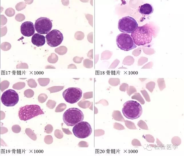 骨穿结果:骨髓增生极度活跃,原始细胞95.5%,POX(现改称为MPO):阳性率15%,呈颗粒状或点状;PAS阳性,呈颗粒状。流式结果:R2占有核细胞94.7%,表达CD34,CD19,CD38,HLA-DR,cCD79a;部分表达CD10,CD20,弱表达CD13,cIgM,不表达CD3,CD4,CD56,CD2,CD5,CD7,CD14,CD33,CD15,CD11b,CD117,sIgM,cMPO;符合Pre B-ALL表型。BCR-ABL1 190:0.39拷贝/有核细胞数;诊断为“急性淋巴细胞白血病,前B细胞性,Ph+,高危组”,于2013.09.14行VDCP方案化疗,化疗后骨髓象达完全缓解。2013.10.13行CAM巩固治疗。2013.10.17开始口服达沙替尼片100mg qd。2013.11.7骨穿结果:增生活跃,未见原、幼淋巴细胞。BCR-ABL1 190融合基因阴性。于2013.11.9予大剂量MTX方案化疗。2013.11.28复查骨穿示:增生减低,原幼淋0%,成熟淋53.5%。2013.12.2予VP方案化疗;2013.12.28给予CAM方案化疗1周期,过程顺利;2014.2.6 骨穿示:增生明显活跃,未见幼淋。2014.2.9予以达沙替尼联合VDCP方案,期间多次复查BCR-ABL1 190均阴性。2014.5.3骨穿示:增生明显活跃,幼淋21.2%,提示复发(图片17-20)。后患者放弃治疗,自行出院。(初发骨髓涂片及细胞化学染色结果见本文开头。)