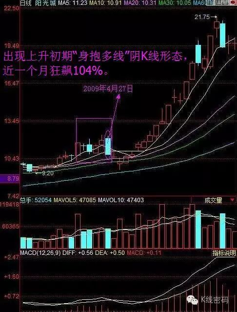 “身抱多线”具有两种形态:一是大阳线包裹前面的多条小K线,二是大阴线包裹前面的多条小K线。两种形态的性质是一样的,均是蓄势待升的信号,投资者可积极关注。
