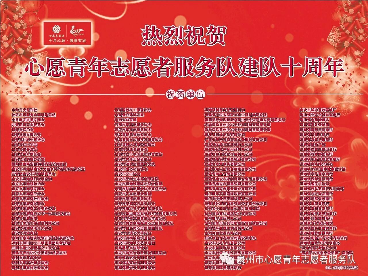10年来,志愿队伍从最初的7人,发展到现在的3000多人,服务区域遍布泉州各县市及大小社区,累计为社会提供志愿服务30多万人次,志愿服务时间50多万小时,先后获得“全国优秀社区志愿服务队”“全国有影响力的志愿服务组织”“福建省志愿服务记录单位”“福建省五四红旗团支部”等荣誉称号。